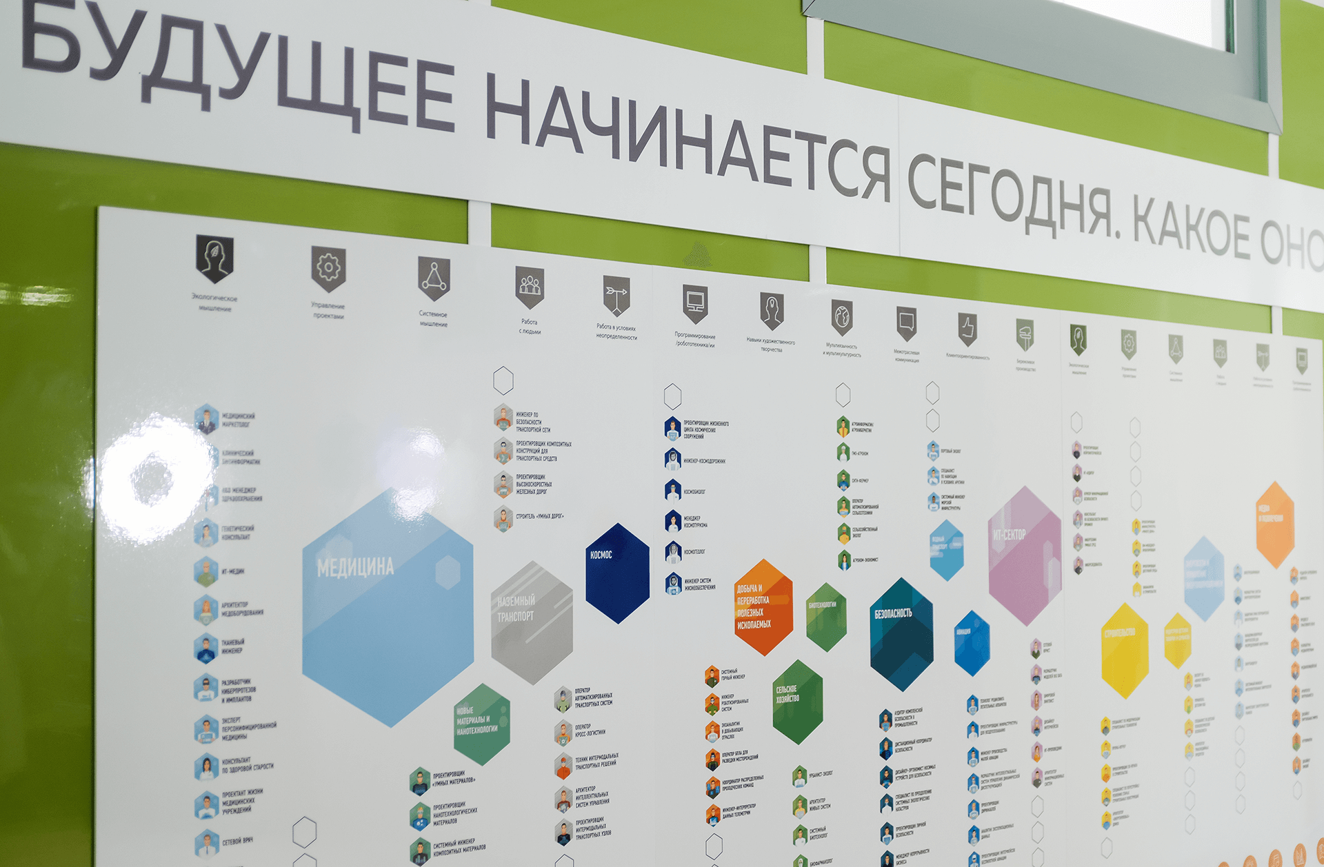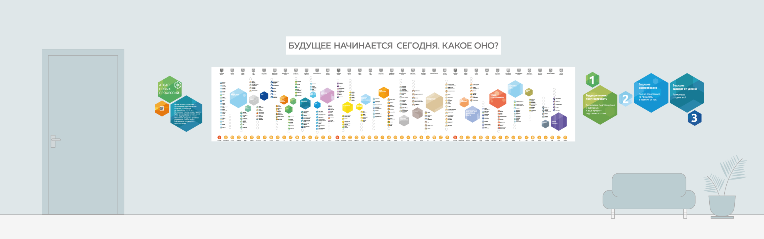 Очень интересное решение совместно с командой "Атлас Профессий". Карта Атласа профессий будущего, специально модифицирована для стен и покрыта маркерной пленкой.