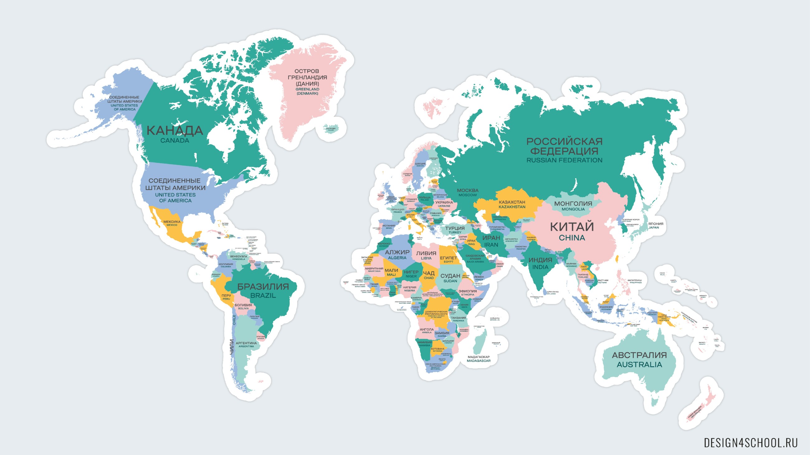 Политическая карта мира с границами государств, названия которых дублируются на английском языке. Большая и наглядная карта станет эффективным инструментом проведения уроков географии для младшей и средней школы.