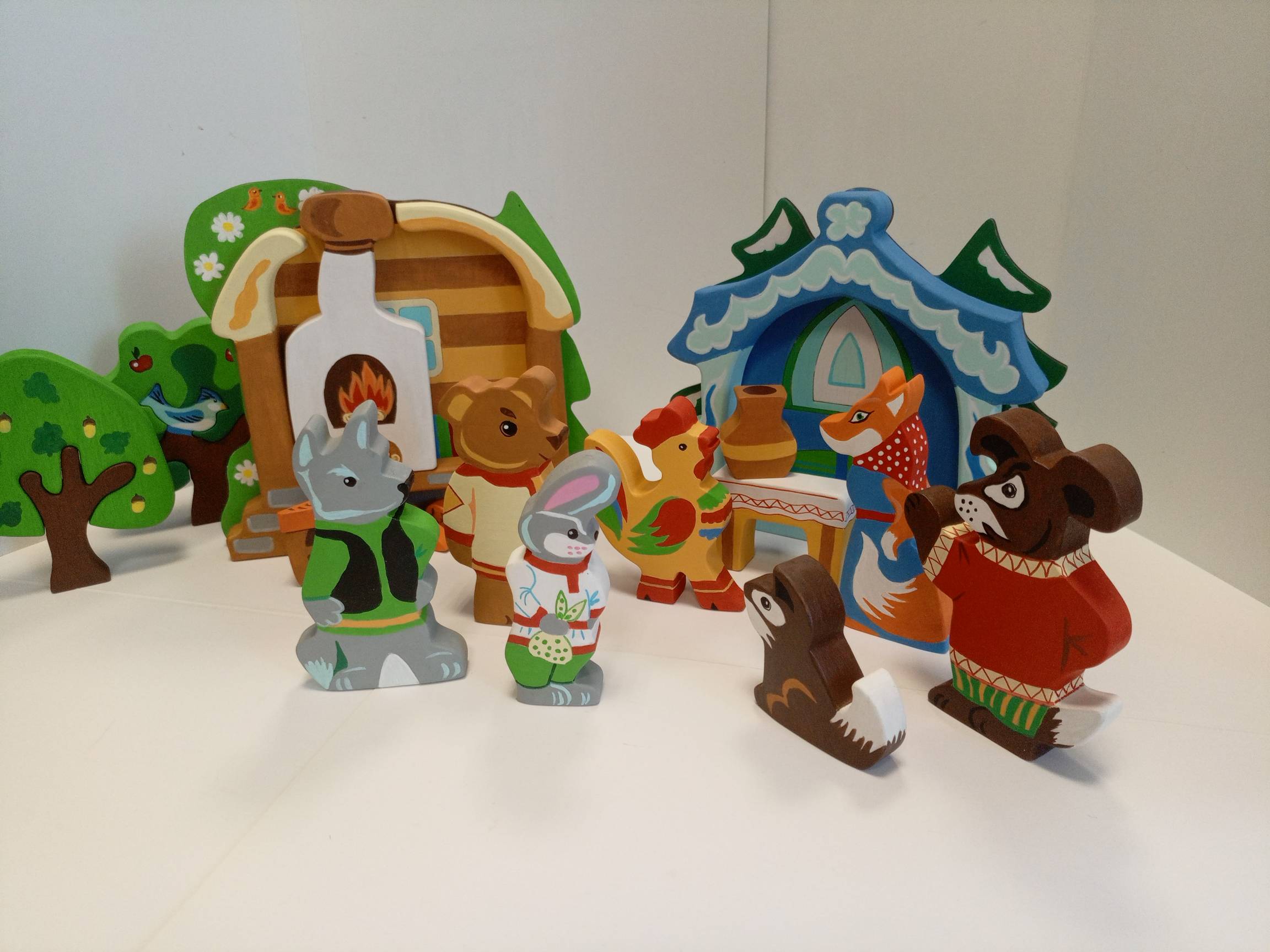 Избушка лубяная с декорацией Зимний лес, избушка ледяная с декорацией Весенний лес, проталины, печка, стол, крынка, скамейка, морковка-3 шт.,  фигурки персонажей сказки-лиса в сарафане, заяц в рубахе, собака и щенок, петух в сапогах, медведь, волк.