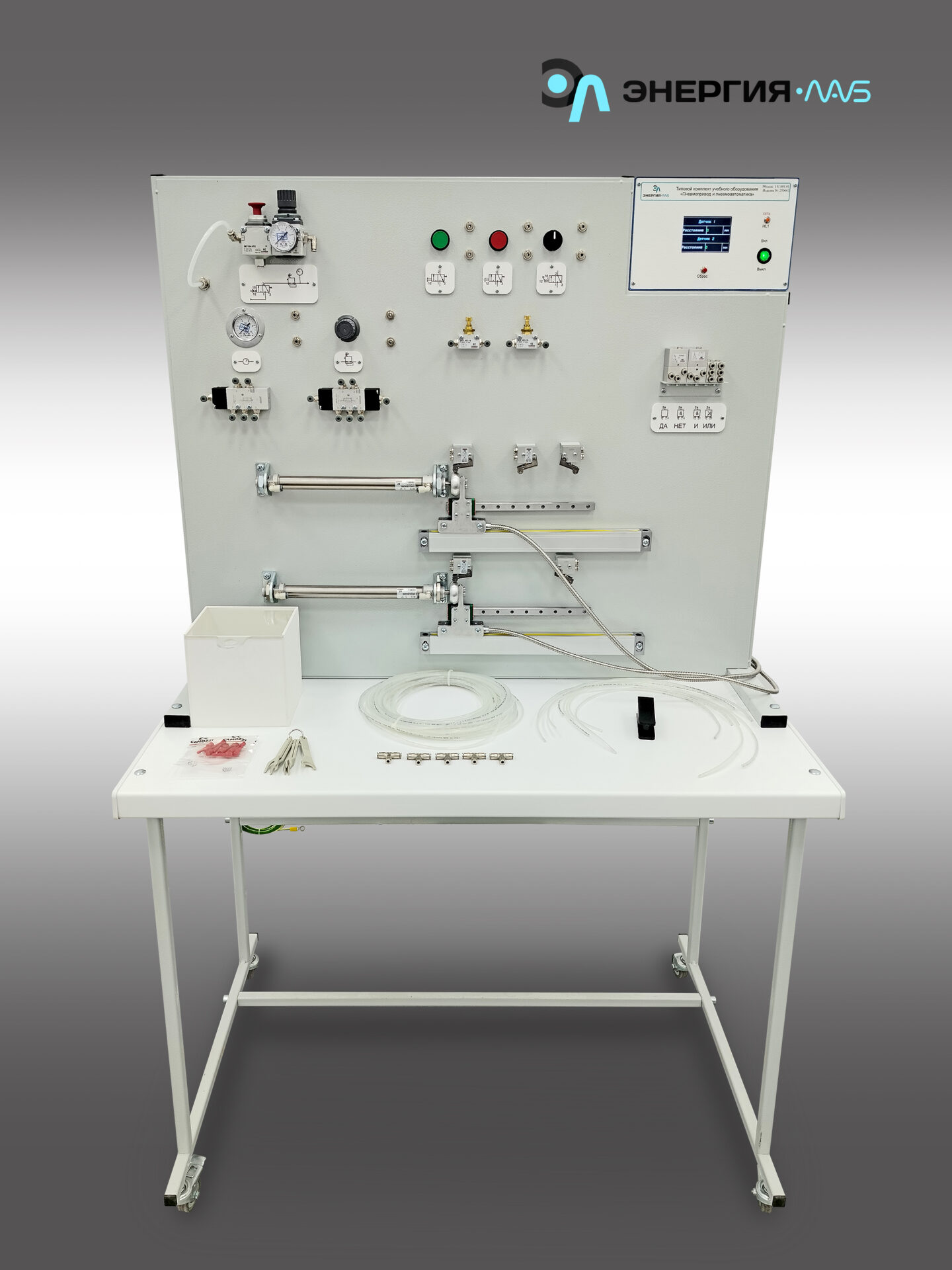 Учебный комплект рассчитан на обучение основам управления пневмоприводами. Элементы пневмоавтоматики жестко закреплены на центральной панели комплекса с целью сокращения времени на монтаж, сохранности элементов и защиты от вандализма. Демонтаж элементов осуществляется только при разборке стенда.