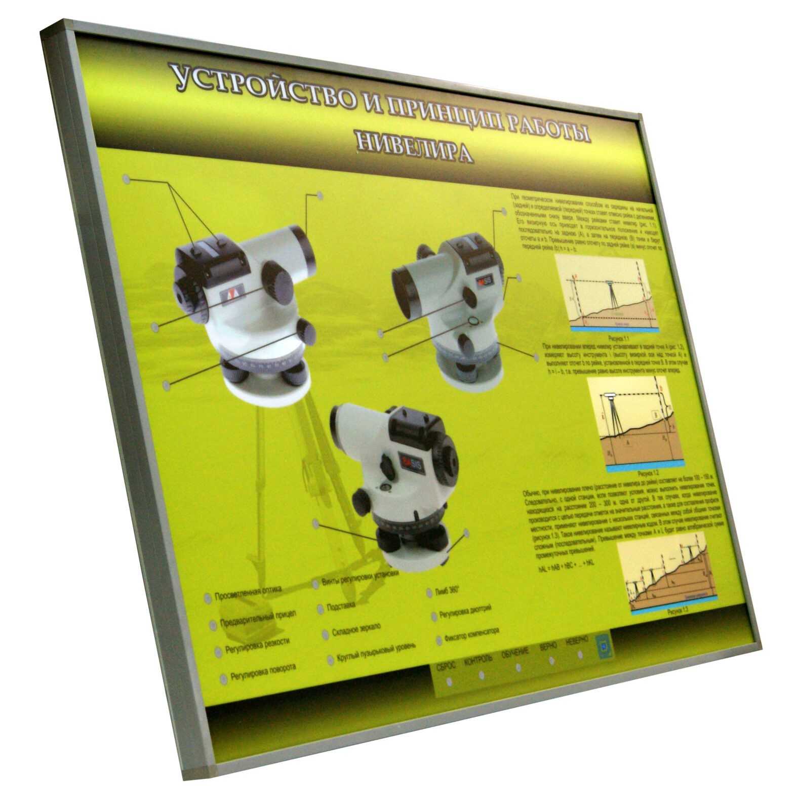 Стенд-планшет светодинамический предназначен для изучения принципа работы нивелира, в профильных учебный заведениях начального и среднего профессионального образования.